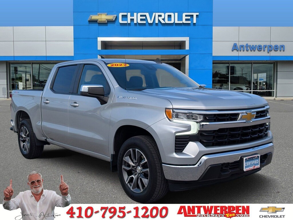 CARFAX One-Owner. *MARYLAND STATE INSPECTION*, *CHEVROLET CERTIFIED*, *WARRANTY INCLUDED*, *20YR/200,000 MILE ENGINE WARRANTY*, *APPLE CAR PLAY/ANDRIOD AUDIO*, *BACK-UP CAMERA*, *REMOTE START*, *ANTI-LOCK BRAKES*, 8-Speed Automatic, 4WD, Black Cloth.2022 Chevrolet Silverado 1500 LT Silver Ice Metallic 4WD17/20 City/Highway MPG Odometer is 7964 miles below market average!Certified. Chevrolet Certified Pre-Owned Details:* 24 months/24,000 miles (whichever comes first) Certified Pre-Owned Scheduled Maintenance Plan and 3 days/150 miles (whichever comes first) Vehicle Exchange Program. SiriusXM 3-month trial subscription.* Vehicle History* Powertrain Limited Warranty: 72 Month/100,000 Mile (whichever comes first) from original in-service date* 172 Point Inspection* Limited Warranty: 12 Month/12,000 Mile (whichever comes first) from certified purchase date* Roadside Assistance* Transferable Warranty* Warranty Deductible: $0Convenience Package (10-Way Power Driver Seat w/Lumbar, 120-Volt Bed Mounted Power Outlet, 120-Volt Instrument Panel Power Outlet, Dual Rear USB Ports (Charge Only), Dual-Zone Automatic Climate Control, Heated Driver & Front Outboard Passenger Seats, Heated Steering Wheel, Keyless Open & Start, Leather Wrapped Steering Wheel, and Manual Tilt/Telescoping Steering Column), High Capacity Suspension Package, Standard Suspension Package, Trailering Package (Hitch Guidance), Chevrolet Certified Pre-Owned Certified, 8-Speed Automatic, 4WD, Black Cloth, 12.3 Multicolor Reconfigurable Digital Display, 3.42 Rear Axle Ratio, 4-Wheel Disc Brakes, 40/20/40 Front Split-Bench Seat, 6 Speakers, 6-Speaker Audio System, ABS brakes, Air Conditioning, All-Star Edition, Alloy wheels, AM/FM radio: SiriusXM with 360L, Apple CarPlay/Android Auto, Auto High-beam Headlights, Auto-Locking Rear Differential, Automatic Emergency Braking, Automatic temperature control, Bluetooth® For Phone, Brake assist, Bumpers: chrome, Chevrolet Connected Access Capable, Chrome Mirror Caps, Cloth Seat Trim, Color-Keyed Carpeting Floor Covering, Compass, Deep-Tinted Glass, Delay-off headlights, Driver door bin, Driver vanity mirror, Dual front impact airbags, Dual front side impact airbags, Electric Rear-Window Defogger, Electrical Steering Column Lock, Electronic Cruise Control, Electronic Stability Control, Following Distance Indicator, Forward Collision Alert, Front anti-roll bar, Front Center Armrest w/Storage, Front dual zone A/C, Front Frame-Mounted Black Recovery Hooks, Front License Plate Kit, Front Pedestrian Braking, Front reading lights, Front wheel independent suspension, Fully automatic headlights, HD Rear Vision Camera, Heated door mirrors, Heated front seats, Heated steering wheel, Illuminated entry, IntelliBeam Automatic High Beam On/Off, Lane Keep Assist w/Lane Departure Warning, LED Cargo Area Lighting, Low tire pressure warning, Not Equipped w/Steering Column Lock, Occupant sensing airbag, OnStar & Chevrolet Connected Services Capable, Outside temperature display, Overhead airbag, Overhead console, Panic alarm, Passenger door bin, Passenger vanity mirror, Power door mirrors, Power driver seat, Power Front Windows w/Driver Express Up/Down, Power Front Windows w/Passenger Express Down, Power Rear Windows w/Express Down, Power steering, Power windows, Premium audio system: Chevrolet Infotainment 3 Premium, Radio data system, Radio: Chevrolet Infotainment 3 Premium System, Rear 60/40 Folding Bench Seat (Folds Up), Rear reading lights, Rear step bumper, Rear window defroster, Remote keyless entry, Remote Vehicle Starter System, Security system, SiriusXM w/360L, Speed control, Speed-sensing steering, Split folding rear seat, Steering Wheel Audio Controls, Steering wheel mounted audio controls, Tachometer, Telescoping steering wheel, Theft Deterrent System (Unauthorized Entry), Tilt steering wheel, Traction control, Trip computer, Variably intermittent wipers, V