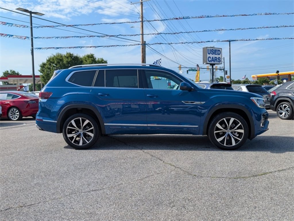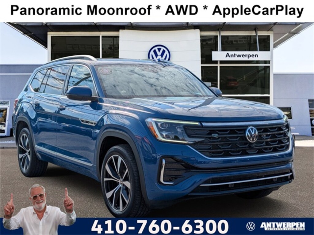 *CARFAX ONE-OWNER*, *ANTWERPEN 20YR/200K WARRANTY*, 10 Speakers, 3rd row seats: split-bench, 4-Wheel Disc Brakes, ABS brakes, Air Conditioning, Alloy wheels, AM/FM radio: SiriusXM with 360L, Auto High-beam Headlights, Auto-dimming Rear-View mirror, Automatic temperature control, Brake assist, Bumpers: body-color, Compass, Delay-off headlights, Driver door bin, Driver vanity mirror, Dual front impact airbags, Dual front side impact airbags, Electronic Stability Control, Emergency communication system: VW Car-Net Safe & Secure 5-year, Exterior Parking Camera Rear, Four wheel independent suspension, Four-wheel Independent Suspension, Front anti-roll bar, Front Bucket Seats, Front Center Armrest, Front dual zone A/C, Front fog lights, Front reading lights, Fully automatic headlights, harman/kardon® Speakers, Heads-Up Display, Heated & Actively Ventilated Front Bucket Seats, Heated door mirrors, Heated front seats, Heated rear seats, Heated steering wheel, Illuminated entry, Leather steering wheel, Low tire pressure warning, Memory seat, Navigation System, Occupant sensing airbag, Outside temperature display, Overhead airbag, Overhead console, Panic alarm, Passenger door bin, Passenger vanity mirror, Perforated Vienna Leather Seating Surfaces, Power door mirrors, Power driver seat, Power Liftgate, Power moonroof: Panoramic, Power passenger seat, Power steering, Power windows, Radio data system, Radio: MIB3 Discover Media w/Navigation, Rain sensing wipers, Rear air conditioning, Rear anti-roll bar, Rear audio controls, Rear reading lights, Rear seat center armrest, Rear window defroster, Rear window wiper, Remote keyless entry, Security system, Speed control, Speed-sensing steering, Split folding rear seat, Spoiler, Sport steering wheel, Steering wheel mounted audio controls, Tachometer, Telescoping steering wheel, Tilt steering wheel, Traction control, Trip computer, Turn signal indicator mirrors, Variably intermittent wipers, Ventilated front seats, Wheels: 21" 2-Tone Machined Alloy. Mountain Lake B 2025 Volkswagen Atlas 2.0T SEL Premium R-Line AWD 8-Speed Automatic with Tiptronic 2.0L TSI